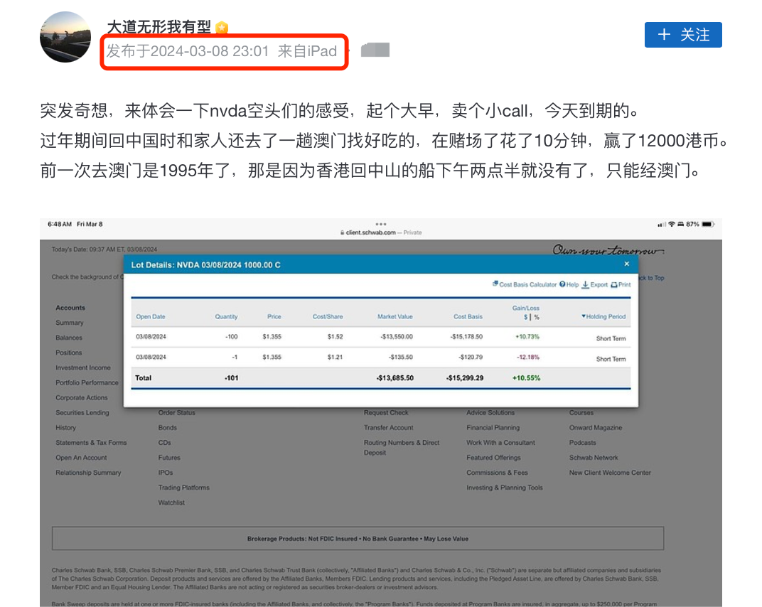 令人拍掌称奇的是,段永平在英伟达股价跳水前(3月8日23:29),卖出英伟达的看涨期权call,似乎成功盈利“三个Vision Pro”。