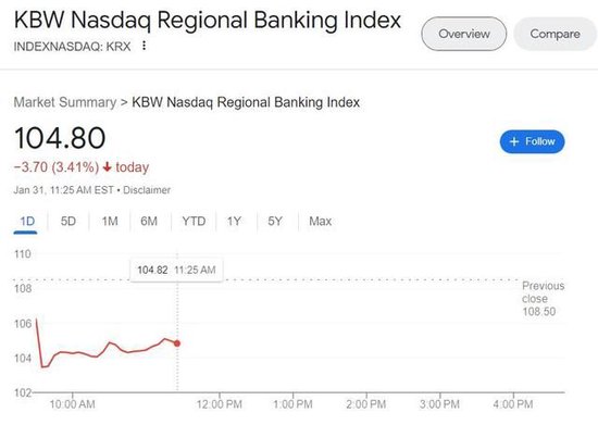 美国地区银行股指创十个月最大跌幅,银行NYCB财报逊色,盘中暴跌超40%